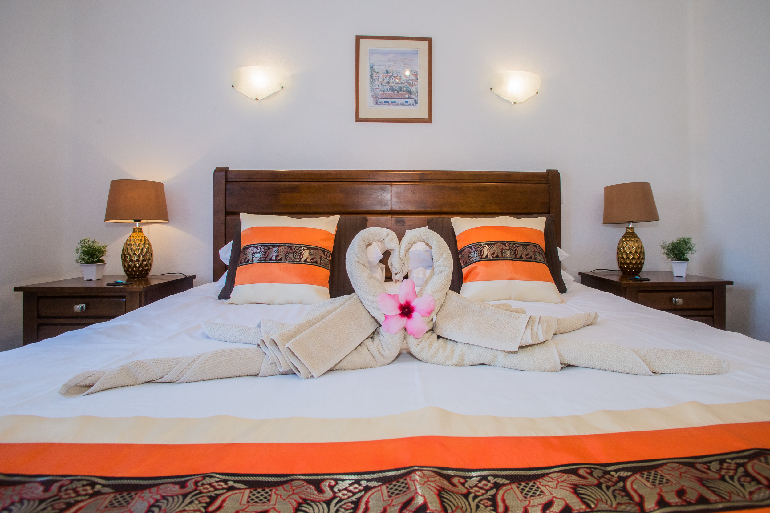 Bedroom 1 has a king size bed, two double wardrobes with drawers, bedside cabinets with lamps and a dressing table. Mosquito nets have been fitted to the window along with black out blind and there is also a ceiling fan. Hairdryer and quality linen are also supplied along with pool towels.